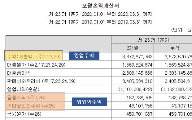 금융수익도 얻은게 있고 겉으로 뭔지는 잘 모르겠는데 기타 영업외수익이 있다.