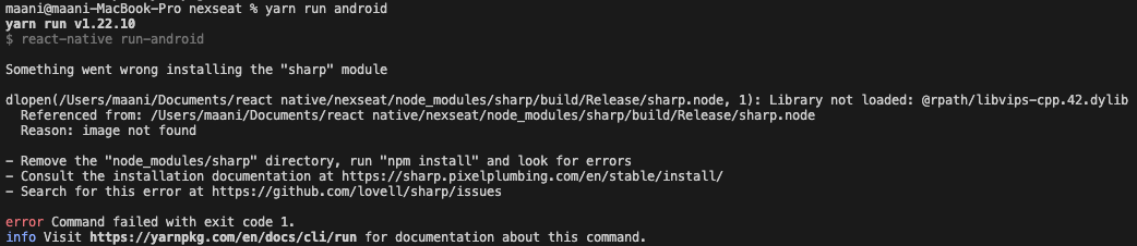 dlopen(/Users/maani/Documents/react native/nexseat/node_modules/sharp/build/Release/sharp.node, 1): Library not loaded: @rpath/libvips-cpp.42.dylib