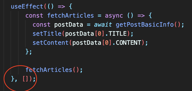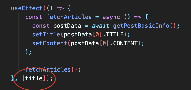 이 useEffect hook 을 다시 수행하지 않지만 [title] 을 적으면 title 만 지켜 보다가 값이 건드렸다! 하는 순간