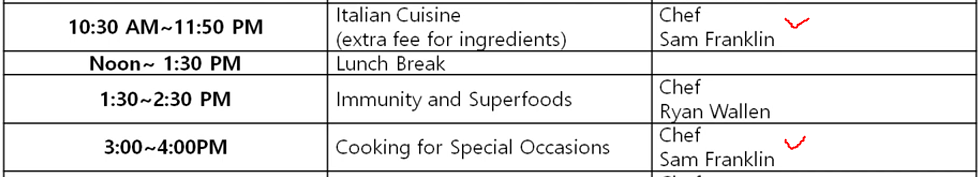 - He will teach a class on Italian Cuisine from 10:30 to 11:50 P.M.