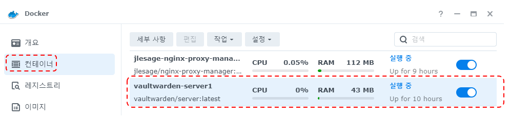 레지스트리에서 vaultwarden 로 검색한 후 이미지를 받는다.