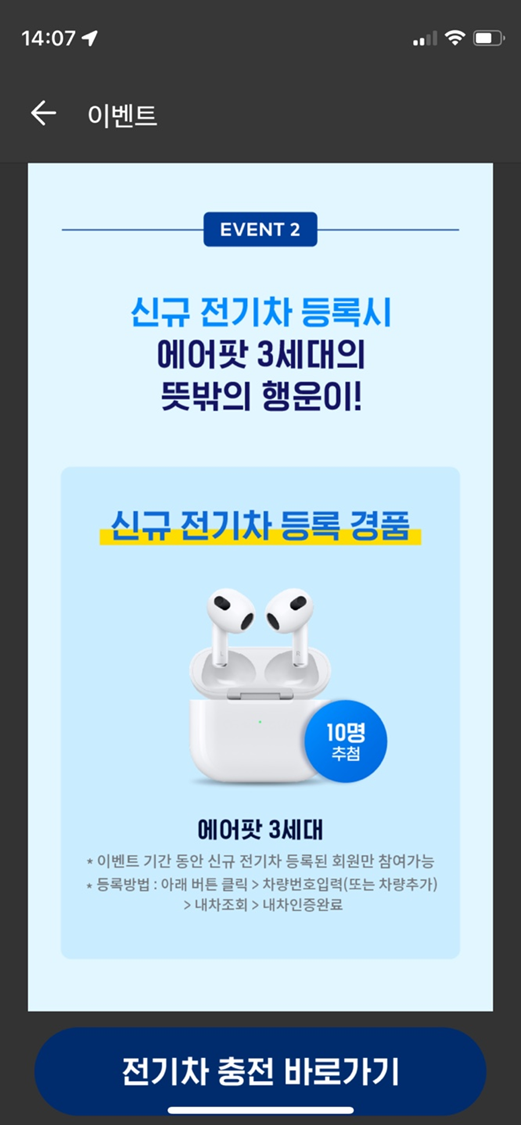전기차를 타고 있는데 카카오내비 앱에서 전기차 등록하면 에어팟을 준다고 한다.
