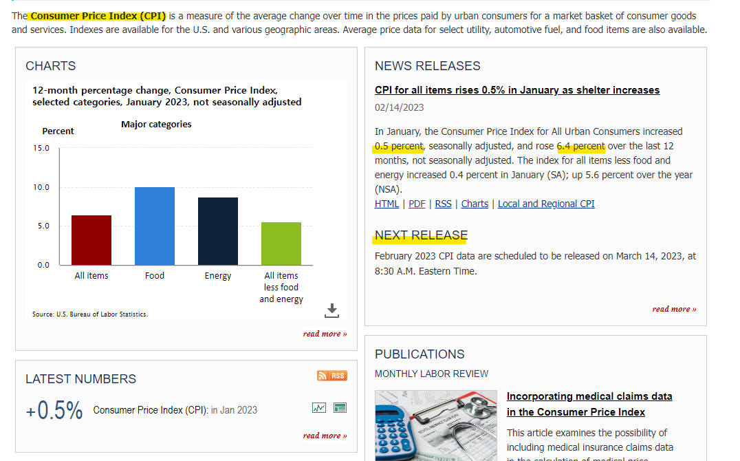 CPI for all items rises 0.5% in January as shelter increases 02/14/2023 In January, the Consumer Price Index for All Urban Consumers increased 0.5 percent, seasonally adjusted, and rose 6.4 percent over the last 12 months, not seasonally adjusted. The inde