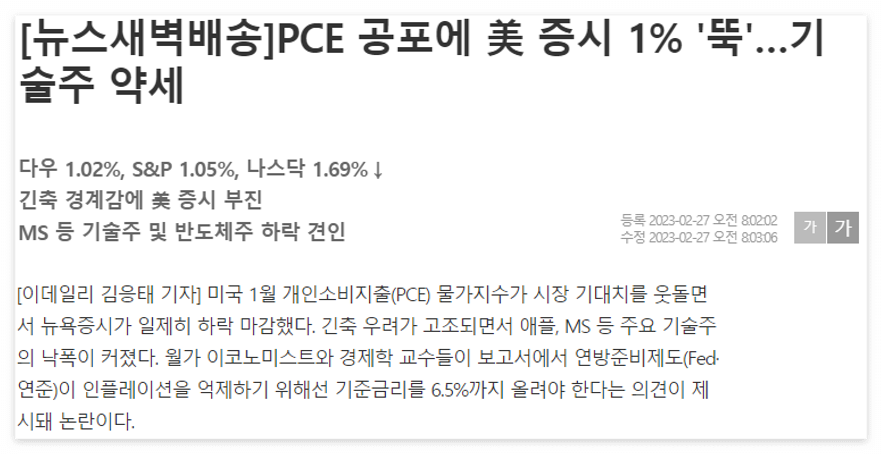 PCE? 라는 소비지출 물가지수를 발표했는데 예상치보다 높게 나와서 증시가 떨어졌다는 뉴스다