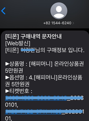 문자메시지로 구매했던 상품권 핀번호가 날라온다