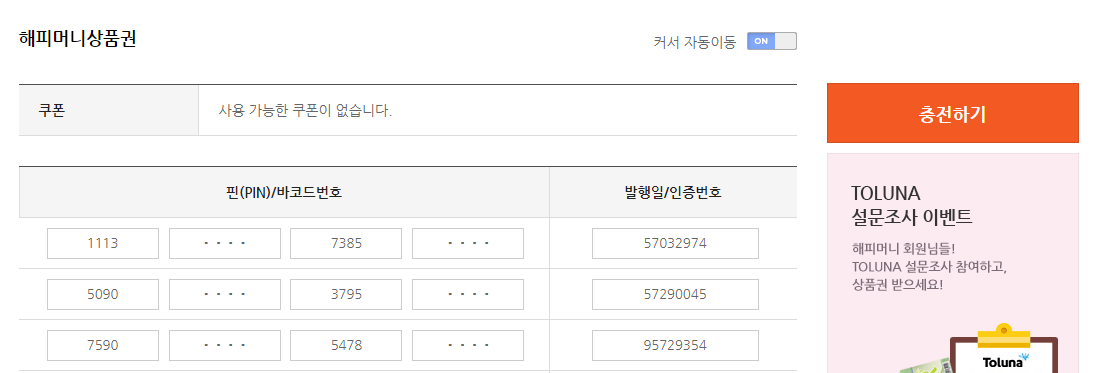 [예외) 온라인문화상품권은 충전하는데 없고 현금화하는데서 즉시 PIN 입력 ]