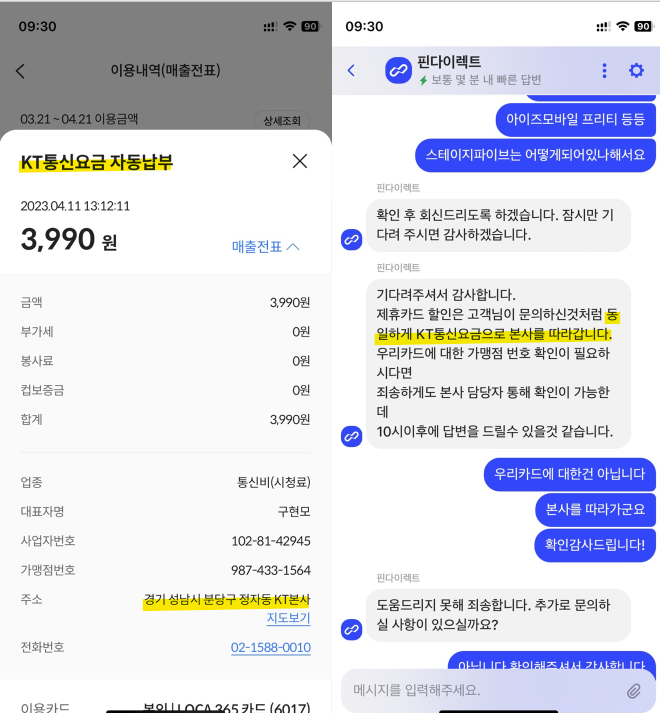 매출전표 상세내역 보니 KT로 찍힘. 즉 할인 적용 O