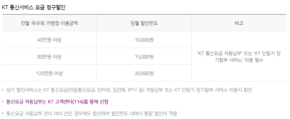 40만원 이상 KT 요금 23,000원 할인이다