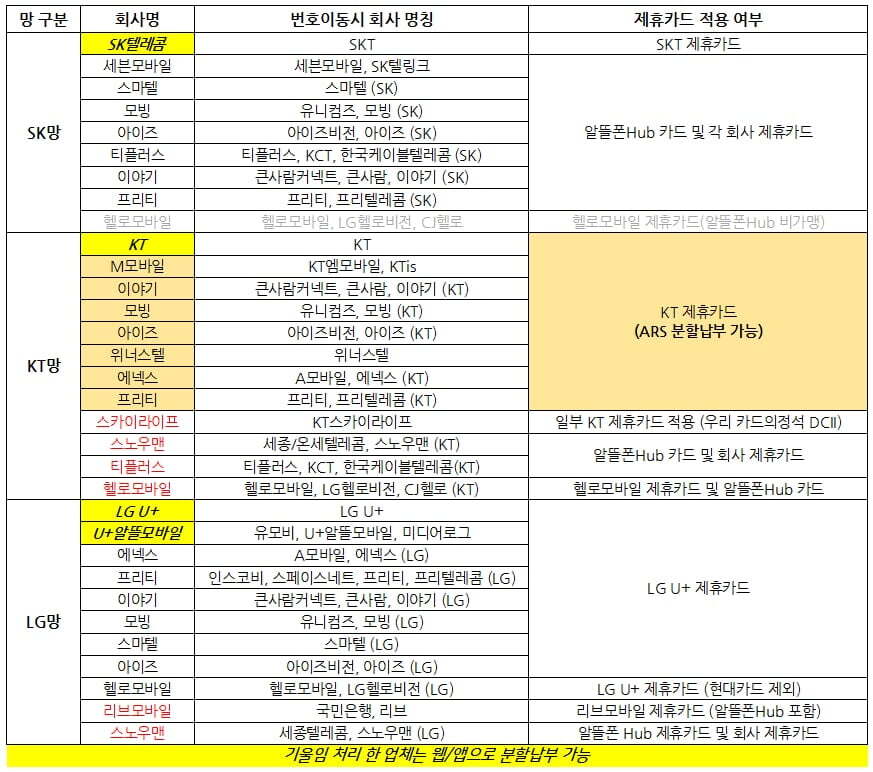 또는 KT 스카이라이프는 앱 내에 분할결제가 있음 KTM모바일도 근데 나머지 아이즈라던가 핀다이렉트 등등 나머지 알뜰은 자체 분할결제가 없긴한데 어짜피 KT 결제망과 한몸이라서 KT꺼 그대로 쓰면 됨(ARS, 간편납부)