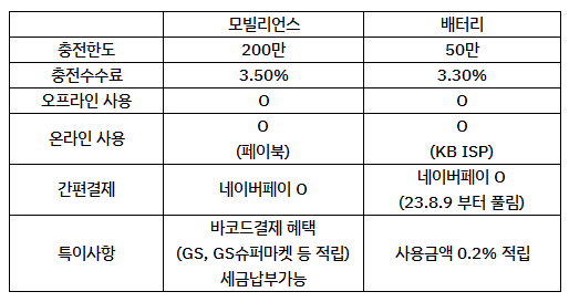 ① 모빌리언스 카드 (충전 수수료 3.5%) ② 다날 배터리카드 (충전 수수료 3.3%) / 23.6.30 까지 수수료 0% 이벤트 중