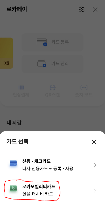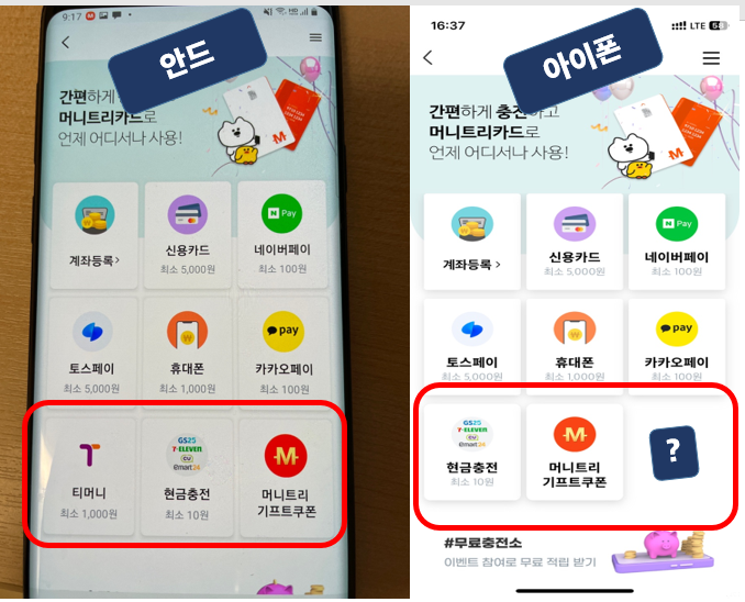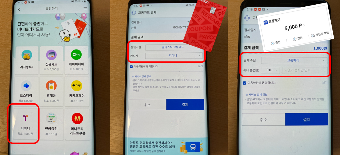 → 안드로이드 모바일캐시비로 충전했으면 모바일캐시비를 선택하고 실물카드를 갖고있으면 플라스틱카드에 캐시비 or 티머니 선택 후 충전