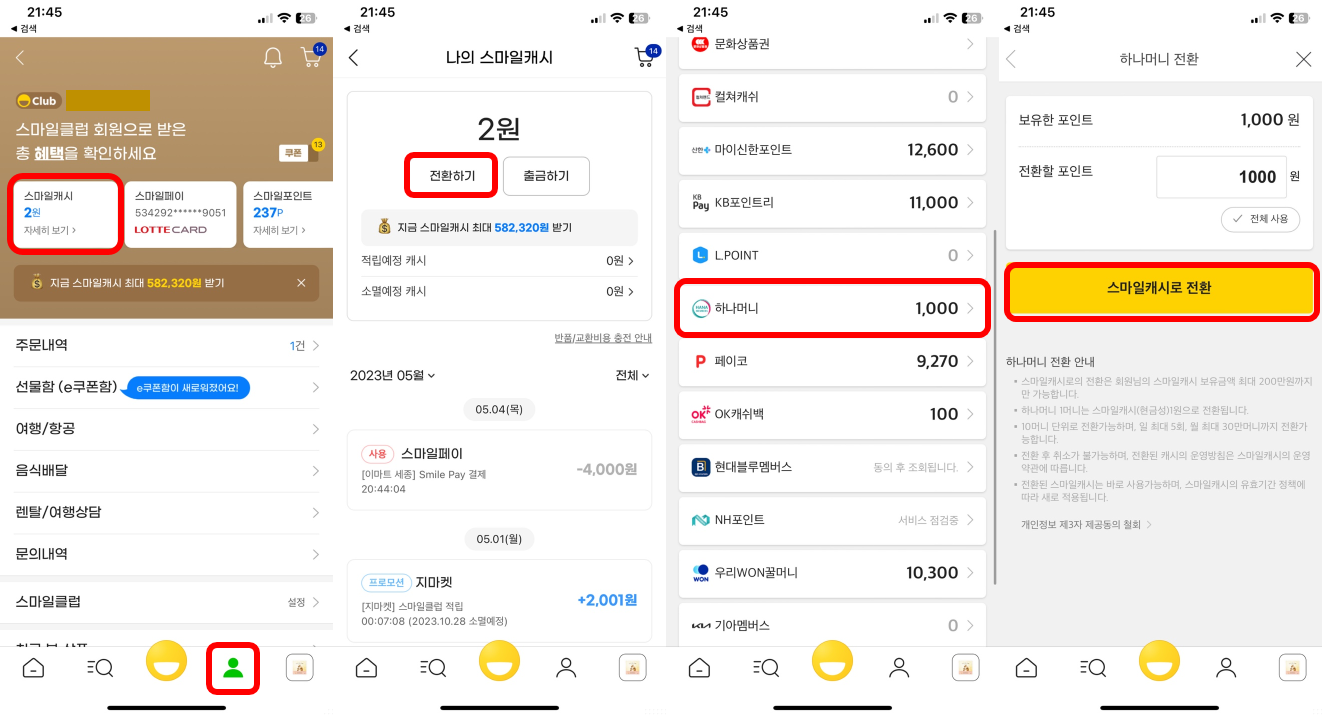 1) 네이버페이 포인트로 전환,수수료 0% 2) SK Pay, 스마일캐시, SSG Money, 해피포인트 전환,수수료 0% 3) L.Point 로 전환,수수료 3% 4) 머니트리 거쳐서 L.Point 전환,수수료 0%