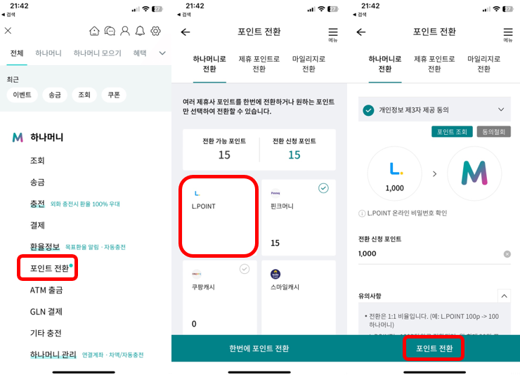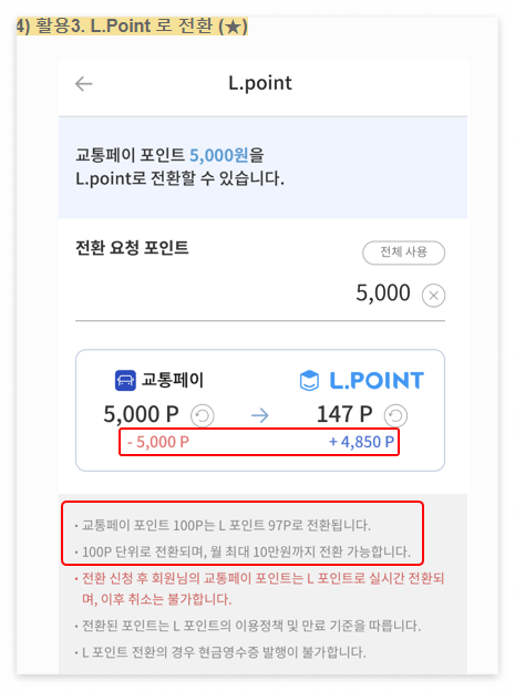 4) 활용3. L.Point 로 전환 (★수수료 3%★) → 수수료가 3% 든다. 다른 네이버나 스마일캐시 SSG 등 은 0%인데... 왜 통행료를 3%나 들게 했을까? 진짜 현금으로 전환할 수 있기 때문이다 (다른 포인트들은 현금으로 바꿀 수 없음 오직 엘포인트만이 현금인출가능)