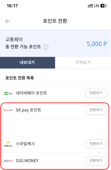 근데 이 머니트리 라는 구세주 어플이 있다... 머니트리에서 교통페이에 있는 캐시를 머니트리 캐시로 전환할 수 있다 (수수료 0%!) 그리고 엘포인트 앱에서 머니트리 캐시를 가져오기 하면 끝! ※ 많지는 않지만 10만원 전환 한도 걸려있음!