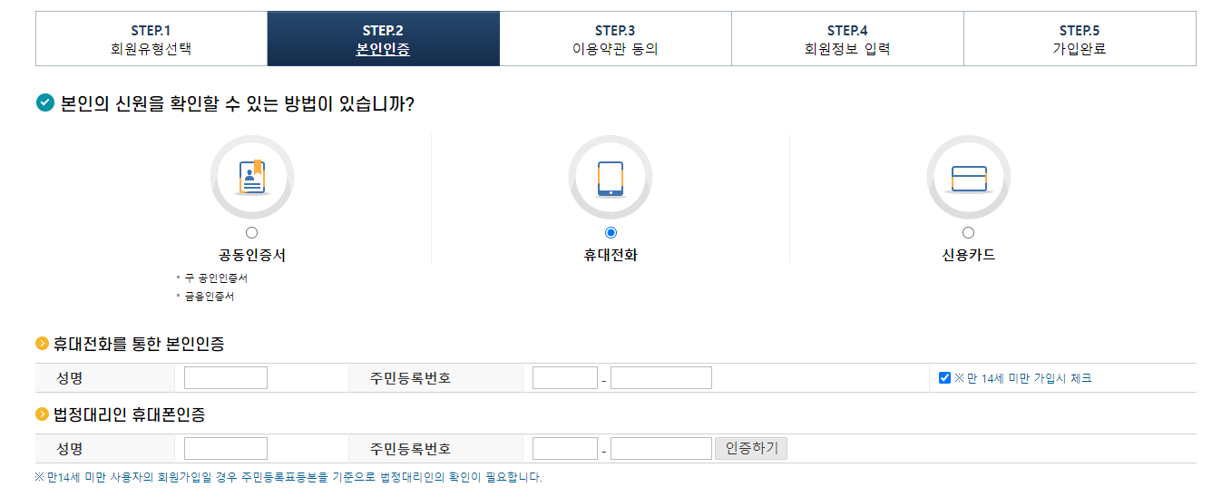 만 14세 미만 체크하면 휴대전화로 빠짐 회원가입이야 간단하니 회원가입 진행