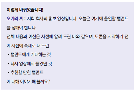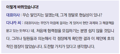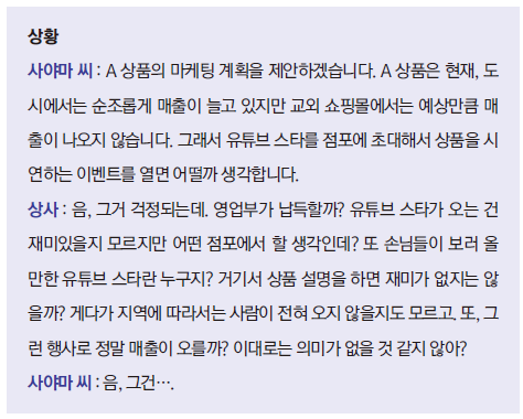 상사의 이야기도 이끌어내라. 부하가 “감히 말씀드립니다”라고 자신의 의견을 이야기하고 나서 “이상입니다. 어떠셨습니까?”라며 답변을 기다려서는 안 된다. 그러면 상사는 당신의 제안을 조금씩 고치기만 할 것임으로 자신의 안을 내고 상사의 안도 이끌어낸 다음, 비교하고 조율하여 최고의 안을 도출하는 것이 좋다