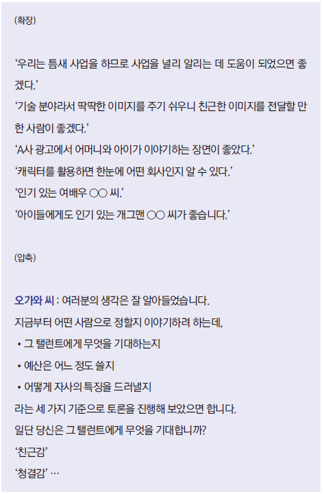 2) 회의 참여자의 사고 확장을 한다. 예를들어‘자사 홍보 영상에 출현할 탤런트를 정하는 것’이 목표라면, 홍보 영상의 내용,탤런트는 누구로할지.. 후보도 정하고, 예산은 얼마고.. 등등 여러가지 토론 소재가 나온다. 머릿속에 있는 생각을 다 꺼내놓는 이게 사고 확장이라고 한다.