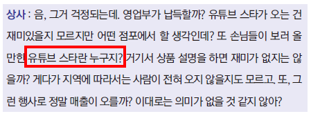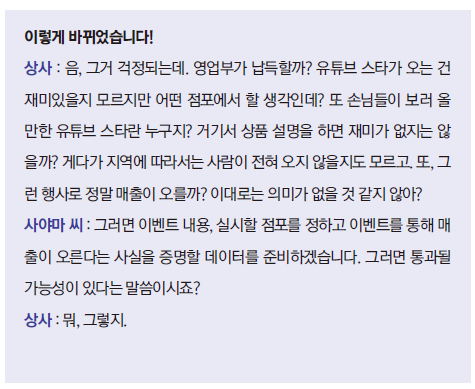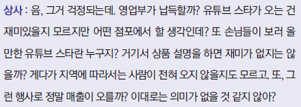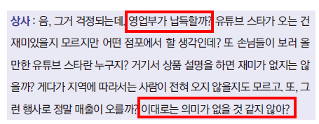 이건 긍정의 여지가 남아있음 ‘유튜브 스타를 출연시켜 이벤트를 한다’는 아이디어는 재미있다고 했으니 ‘이벤트 내용, 개최 장소를 정하고 이벤트로 매출이 오른다는 것을 증명할 데이터를 마련하면 제안이 통과될 가능성이 있다’는 말로 해석할 수 있다.