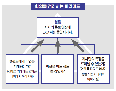 회의 진행자는 참석자의 발언을 가지고 근거의 피라미드를 만들어 나가는 작업을 주도해야 한다.