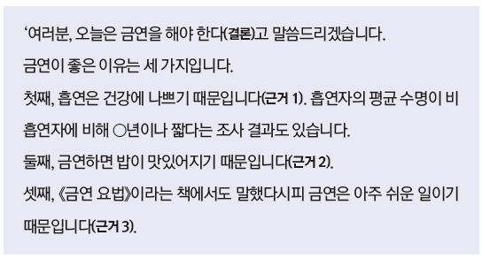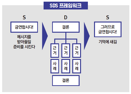 ✅ SDS ➡️ Summary(요약) , Detail(상세) , Summary(요약) ‘여러분, 오늘은 금연을 해야 한다(결론)고 말씀드리겠습니다. 모두 금연합시다! 금연이 좋은 이유는 세 가지입니다. 첫째, 흡연은 건강에 나쁘기 때문입니다. 예를 들어 흡연자의 평균 수명이 비흡연자보다 ○년이나 짧다는 조사 결과가 있습니다. 둘째, 금연하면 밥이 맛있어지기 때문입니다. 셋째, 《금연 요법》이라는 책에서도 말했다시피 금연은 아주 쉬운 일이기 때문입니다. 그러므로 여러분, 금연합시다!'
