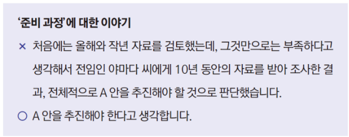 ✅ 열심히 준비했다는 것을 알리고 싶은가? ➡️ 그런데 상대도 그런 이야기를 듣고 싶어할까? 상대는 당신의 결론부터 듣고 판단하기 때문
