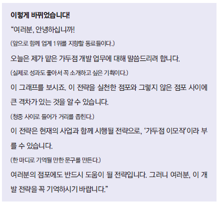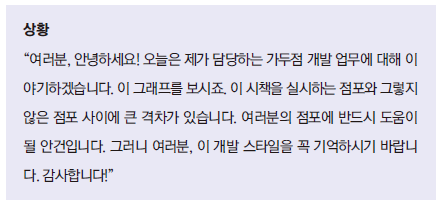 전부 같은 어조로 이야기하면 졸리다. 이 부분은 목소리를 키워야지, 여기는 낮춰야지 억지로 하지 말자. 이 얘기가 아니라 하나하나의 표현과 말에 의미를 담아서 전달해보자. 무슨 말이냐면 “여러분, 제가 담당하는 가두점 개발 업무에 대해 이야기하겠습니다" 라는 문장에서. ‘여러분’이란 어떤 ‘여러분’일까? 같이 일해온 팀원? 지역 내 친목단체? 그렇다면 그런 마음을 단어 하나하나에 담아서 이야기 하고 있는가?