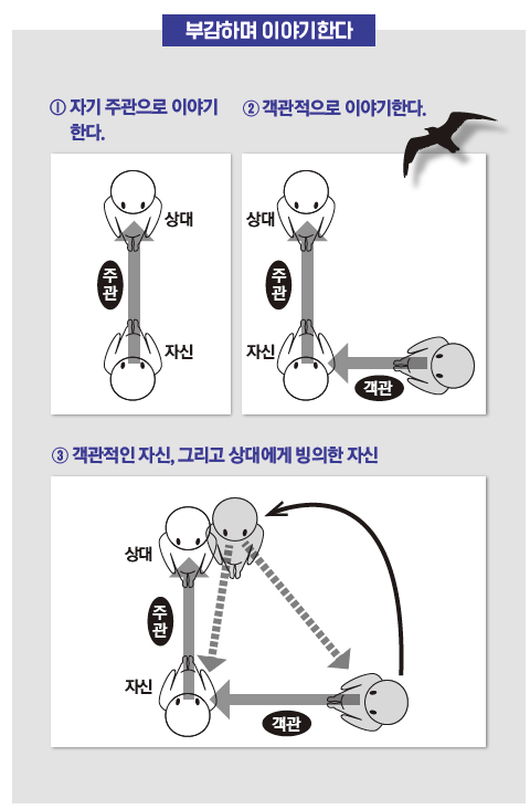 대화를 잘하기 위한 요령은 자신의 의견이라는 ‘주권’을 내세우면서도 상황을 부감하는 ‘객관성’을 잃지 않는 것이다. ‘주관적 자신’이 의견을 말한 다음에는 ‘객관적 자신’이 역할을 넘겨받아 온화한 눈으로 상사와 자신을 지켜보면서 냉철하게 합의점을 찾아 나가자. ‘객관적 자신’이 이것저것 생각하는 사이에 자신의 주장을 한 번 더 확실히 전달해야겠다는 생각이 들면 ‘주관적 자신’ 을 다시 등장시키고, 이처럼 주관과 객관을 교대로 등장시키는 일을 반복하면 된다