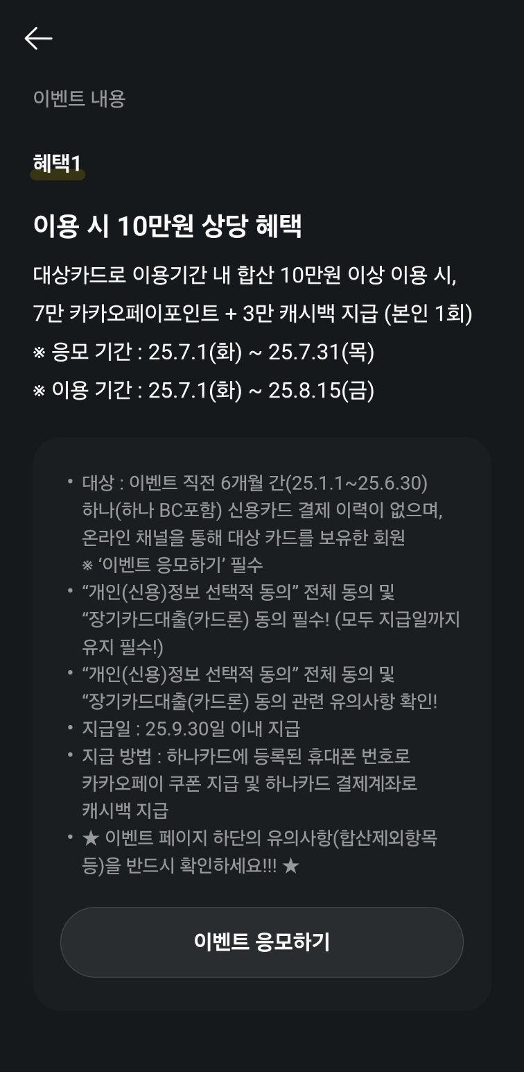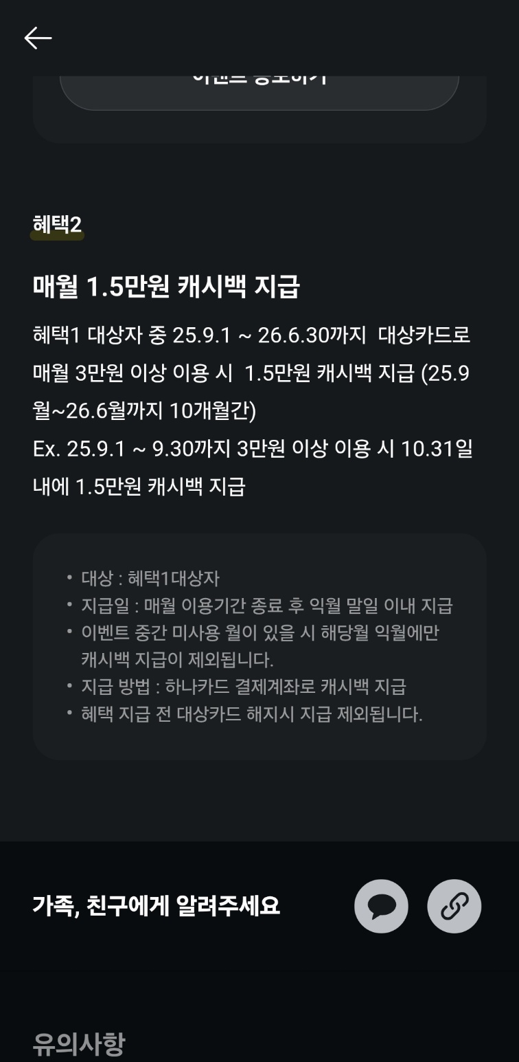 -> 25.9.1 ~ 26.6.30 까지 사용하면 다음달 말일 이내 1.5만 결제계좌로 캐시백