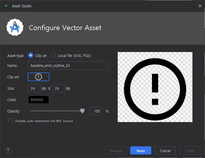 - Android Studio 프로젝트 폴더 우클릭 → New → Vector Asset 클릭.